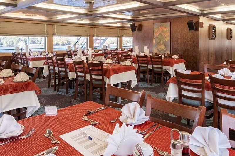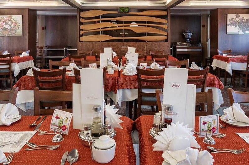 Просторный зал на шлюпочной палубе, днём залитый солнечными лучами из огромных окон, а вечером – приятным светом элегантных плафонов. Аристократическая сервировка столов и высококлассное обслуживание создают особую атмосферу.