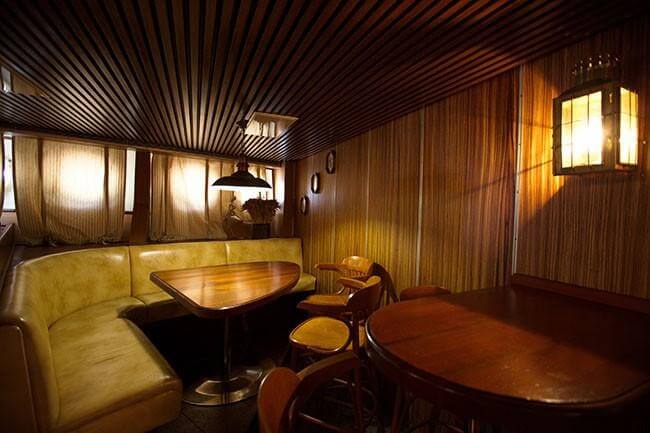 Уюта добавляют классические шторы и светильники с трапециевидными абажурами. Гостей ждут изысканные закуски, барная карта с необычными фирменными коктейлями и хорошая музыка.