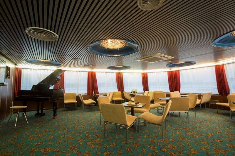 А на носу шлюпочной палубы – музыкальный салон для настоящих эстетов. Обстановка отсылает в 1960–1970-е годы, из окон открывается панорамный вид на речные просторы, а у стены расположился классический рояль.